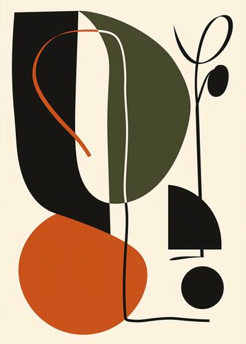 Plakat z serii minimalistyczne zatytułowany Symfonia Graweru. Plakat charakteryzuje się odważnym połączeniem abstrakcyjnych form i linii, które razem tworzą złożoną i intrygującą kompozycję. W palecie barw znajdują się głęboka czerń, spokojna oliwka, energiczna pomarańcza i stonowane beże, które nadają dziełu wyrafinowany, ale dynamiczny charakter. Kontrastowe kształty i płynne linie sugerują ruch i harmonię, mogące reprezentować muzykalność lub wewnętrzne połączenia. Ten plakat idealnie wpasuje się w nowoczesne, minimalistyczne wnętrza, które doceniają sztukę abstrakcyjną jako sposób wyrażania emocji i twórczej energii. Idealny do salonów, przestrzeni kreatywnych lub biurowych, wprowadzając do nich element unikatowego designu.
