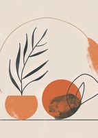 Plakat z serii boho zatytułowany Tonacja Pasteli. Plakat przedstawia harmonijną kompozycję elementów natury i abstrakcyjnych kształtów. Widzimy doniczkę z delikatną rośliną o czarnych, smukłych liściach, które delikatnie kontrastują z ciepłym odcieniem pomarańczy naczynia. Towarzyszą jej geometryczne formy: dwa krągłe kształty w tonacji ziemi, które przeplatają się, tworząc iluzję przestrzeni i głębi. Rysunek uzupełnia subtelna linia horyzontu i rozproszone kropki, dodające plakatowi dynamiki. Idealnie sprawdzi się jako element dekoracyjny w pomieszczeniach, gdzie dominuje spokój i równowaga, takich jak jasne, przestronne salony, pokoje do medytacji lub ciche zakątki bibliotek.