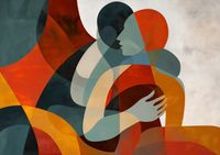 Plakat z serii abstrakcja zatytułowany Objęcia. Artystyczne przedstawienie dwóch postaci w uścisku, z wyraźnymi, płynnymi liniami i bogatą paletą kolorystyczną od ciepłych pomarańczy po chłodne odcienie błękitu i szarości. Grafika ta łączy abstrakcję z emocjonalną głębią, sugerując intymność i ciepło relacji. Idealnie komponuje się w nowoczesnych przestrzeniach mieszkalnych lub jako wyrazisty akcent w kreatywnych biurach. Ten plakat może również znaleźć miejsce w galeriach sztuki oraz w pomieszczeniach przeznaczonych do medytacji i refleksji, zachęcając do zastanowienia nad ludzką bliskością i uczuciami.