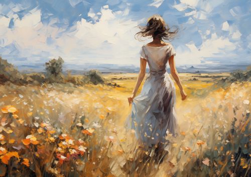 Plakat z serii pejzaże zatytułowany Podmuch Lata, przedstawia kobietę w lekkiej sukience, idącą przez kwitnące pole w kierunku otwartego horyzontu. Jej włosy rozwiewane przez wiatr dodają kompozycji dynamiki i lekkości. Styl plakatu, przypominający impresjonizm, z jego żywymi pociągnięciami i jasnymi barwami, oddaje uczucie ciepła i radosnego spokoju. Postać kobiety, choć anonimowa, jest wyraźnie zatopiona w chwili, co nadaje scenie uniwersalny charakter refleksji i osobistego poszukiwania. Plakat ten doskonale wpasuje się do wnętrz, które chcą oddać atmosferę spokoju, optymizmu i kontemplacji, takich jak salony, pokoje relaksacyjne, studia jogi, a także jako odświeżający element w przestrzeniach biurowych, przynosząc inspirację i uczucie pozytywnego nastawienia do życia.