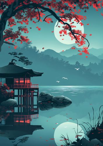 Plakat z serii motywy wschodnie zatytułowany Japoński Pawilon. Ten plakat emanuje spokojem dzięki scenie przedstawiającej tradycyjny japoński pawilon, otoczony przez wodę i delikatnie pochylające się czerwone liście klonu. Ciepłe światło wschodzącego księżyca i subtelne odbicie w wodzie podkreślają atmosferę ciszy i refleksji. Delikatne sylwetki przelatujących ptaków dodają element życia i ruchu. Plakat ten idealnie wpisuje się w przestrzenie współczesne, minimalistyczne, a także te, które celebrują naturę i spokój, takie jak pokoje do medytacji, jadalnie, czy też poczekalnie w spa.