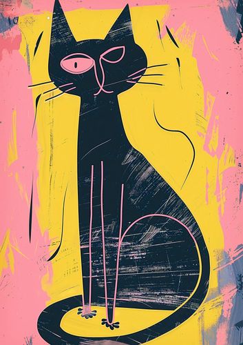 Plakat z serii abstrakcja zatytułowany Kontrastowa Kotka. Praca artystyczna przedstawia stylizowaną, abstrakcyjną sylwetkę czarnego kota na tle żywych, nieregularnych pociągnięć pędzla w odcieniach różu i żółci. Wzrok kota, zaznaczony jednym dużym różowym okiem, przyciąga uwagę i dodaje kompozycji charakteru. Mocne, geometryczne linie i intensywne kontrasty kolorystyczne tworzą nowoczesną i dynamiczną ilustrację, która przyciąga wzrok i staje się wyrazistym elementem dekoracyjnym. Plakat ten idealnie sprawdzi się w przestrzeniach miejskich, takich jak nowoczesne mieszkania, studia graficzne lub awangardowe kawiarnie, nadając wnętrzom śmiałości i wyjątkowego, artystycznego akcentu.