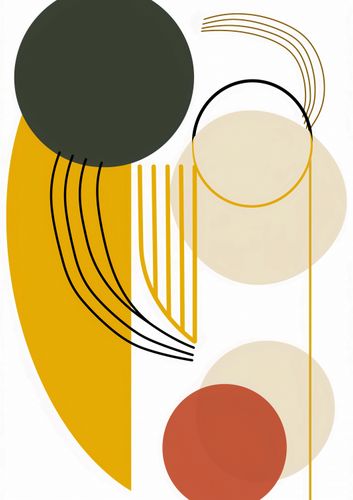 lakat z serii minimalistyczne zatytułowany Słońce i Cienie. Przedstawia on zbiór geometrycznych kształtów w ciepłej palecie barw, w którym dominuje złocista żółć przypominająca słońce. Okrągłe i półokrągłe formy zestawione z liniowymi elementami tworzą wizualną grę światła i cienia, nawiązując do cyklu dnia i nocy oraz dynamiki między jasnością a mrokiem. Plakat ten z pewnością ożywi i doda charakteru nowoczesnym biurom, przestrzeniom kreatywnym, a także może stanowić elegancki akcent w minimalistycznych salonach lub sypialniach, dodając im ciepła i artystycznej głębi.
