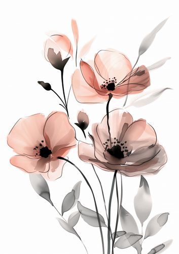 Plakat z serii wnętrza zatytułowany Subtelny Okaz to artystyczna interpretacja delikatnych kwiatów maku. Ilustracja przedstawia kwiaty w pastelowych odcieniach różu i pomarańczy z subtelnymi szarości i akcentami czerni, co nadaje kompozycji miękkiego i eterycznego charakteru. Przezroczyste płatki z lekko zarysowanymi konturami są przedstawione na tle w tonacji jasnego beżu, co pozwala na pełne skupienie na delikatności i pięknie kwiatów. Wykorzystanie minimalizmu i delikatności kolorów sprawia, że plakat emanuje spokojem i elegancją. Idealny do przestrzeni, które cenią sobie spokój i naturę, takich jak salony spa, pokoje gościnne, czy jadalnie, gdzie może dodać odrobinę subtelnego uroku i świeżości.