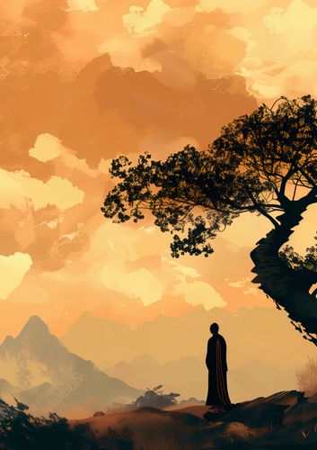 Plakat z serii motywy wschodnie zatytułowany Zen. Plakat przedstawia malowniczy krajobraz w ciepłych odcieniach pomarańczy i brązu, sugerujący scenerię o zachodzie słońca. Centralny punkt obrazu to sylwetka krętego drzewa z gęstym, czarnym liśćmi, wyróżniającego się na tle zachmurzonego nieba. U jego podnóża stoi samotna postać ludzka, która wydaje się rozważać lub podziwiać otaczający ją pejzaż. W oddali majaczą zarysy górskie, co dodaje głębi i tajemniczości kompozycji. Całość tworzy atmosferę spokoju, refleksji i połączenia z naturą. Świetnie sprawdzi się w pomieszczeniach o tematyce orientalnej jak i salonach psychologicznych.