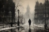 Plakat z serii wnętrza zatytułowany Mgła nad Londynem, przedstawia samotną sylwetkę przechadzającą się po mokrych, połyskujących bruku ulic, otoczoną przez klasyczne kamienice i latarnie uliczne, które rzucają cień na mglistą scenę. Szarości i sepii użyte w dziele podkreślają jego vintage charakter, a zarys wieży w tle przywołuje ikoniczny obraz Londynu. To dzieło sztuki idealnie wpasuje się w przestrzenie, gdzie chce się wywołać atmosferę tajemniczości i klasyki, takie jak biblioteki, salony w stylu retro, czy klasyczne biura prawnicze, zapewniając im wyrafinowany, metaforyczny akcent.