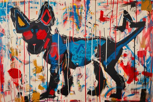 Plakat z serii abstrakcja zatytułowany Miejski Pies. Żywa kompozycja przedstawia sylwetkę psa w stylu street art w której dominują kolory takie jak czerwień, niebieski i żółty, które są rozmieszczone na płótnie w sposób dynamiczny i spontaniczny. Praca wydaje się być pełna ruchu dzięki pociągnięciom pędzlem i kroplom farby rozpryskującym się w różnych kierunkach. Na pierwszy plan wyłania się czarna sylwetka psa, której kontury są podkreślone kontrastującymi barwami i szkicowym stylem. W tle można dostrzec chaotyczne linie i formy, które mogą symbolizować miejski chaos i energię, a także fragmenty tekstu, które dodają dziełu charakteru ulicznego muralu. Całość sprawia wrażenie radosnej i pełnej energii ekspresji artystycznej. Świetnie sprawdzi się w nowoczesnych przestrzeniach miejskich.
