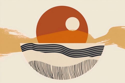 Plakat z serii boho zatytułowany Pół na Całość. Plakat przedstawia uproszczony, geometryczny krajobraz, w którym słońce jest głównym bohaterem, stanowiąc centralny punkt kompozycji. Jego okrągły kształt dominuje na tle abstrakcyjnych wzgórz i falujących linii, które mogą przypominać wzburzone morze lub piaszczyste wydmy. Kolorystyka plakatu to spokojna paleta ciepłych odcieni pomarańczu, beżu i czerni, która nadaje dziełu głębi i kontrastu.Ten plakat będzie wspaniałym dodatkiem do wnętrz urządzonych w ciepłych, ziemistych barwach, gdzie może dodać nowoczesnego charakteru. Idealnie sprawdzi się jako punkt centralny w przestrzeniach, które korzystają z naturalnego światła, takich jak salony, gabinety czy przestronne hole.