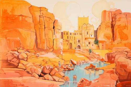 Plakat z serii abstrakcja zatytułowany Ruiny pod Słońcem. Ta ilustracja przedstawia scenę z antycznymi ruinami w ciepłej, pastelowej palecie kolorów, która oddaje odczucie spiekoty i światła słonecznego. Zarysy starożytnej architektury wyrastają z pustynnego krajobrazu, nadając scenerii poczucie wieczności i historii. Odbicie wody i subtelne sylwetki postaci w tle wprowadzają ludzki wymiar do tej scenerii, sugerując trwającą obecność i ciągłość cywilizacji. Plakat ten idealnie wprowadzi do każdego wnętrza element przygody i odkryć, inspirowany podróżami i historią, idealny dla przestrzeni publicznych, biur podróży, a także jako dekoracja w domach miłośników historii.