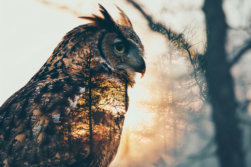 Plakat z serii natura zatytułowany Sowi Duch. Prezentuje on majestatyczną sylwetkę sowy zlewaną z tłem o zachodzie słońca w lesie, co podkreśla jej dziką naturę i instynktowną mądrość. Ciepłe odcienie zachodzącego słońca i sylwetki drzew przenikają się z delikatnym konturem sowy, tworząc wrażenie jedności z naturą. Plakat ten idealnie wpasuje się w przestrzenie takie jak gabinet, biblioteka lub salon, gdzie może inspirować do refleksji i spokoju, przypominając o głębokich, nieodkrytych aspektach natury.