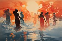 Plakat z serii wnętrza zatytułowany Taneczny Żar, przedstawia grupę osób tańczących w rytmicznych ruchach w wodzie, z tłem zapalającego się nieba w odcieniach ciepłego pomarańczu i czerwieni. Postacie są przedstawione w dynamicznych pozach, z włosami rozwianymi przez wiatr, co nadaje obrazowi wrażenie ruchu i pasji. Styl plakatu, z jego płynnymi liniami i żywymi kolorami, tworzy uczucie energii i życia. Ten plakat idealnie nadaje się do wnętrz, które chcą uchwycić esencję ruchu, radości i wolności, takich jak studia taneczne, kreatywne przestrzenie pracy, a także jako inspirujący element w domach, gdzie może stanowić przypomnienie o pięknie wspólnych chwil i celebracji życia.