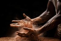 Plakat z serii wnętrza zatytułowany Taniec Ziemi. Dramatyczne zdjęcie rąk artysty, które rzucają w powietrze obłoki brunatnego pyłu, przypominającego ziemię, przeciwko głęboko czarnemu tłu. Dynamiczne ruchy, uchwycone w jednej chwili, emanują siłą i pasją, a ekspresja ciała dodaje obrazowi życia i energii. Ten plakat pasuje do przestrzeni współczesnych i kreatywnych, takich jak studia artystyczne, sale taneczne, czy też jako wyrazisty akcent w nowoczesnych biurach. Z pewnością zainteresuje osoby ceniące sztukę, ruch i ekspresję.