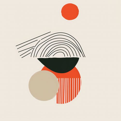 Plakat z serii boho zatytułowany Centralne Słońce to dzieło artystyczne utrzymane w stonowanej palecie kolorystycznej, na którym dominują geometryczne kształty i linie. Na górnej części kompozycji widnieje małe, jaskrawe czerwone koło, które może symbolizować słońce lub inny punkt centralny. Poniżej znajduje się czarna, półokrągła forma z koncentrycznymi liniami, przypominającymi ułożenie naturalnych warstw kamienia lub drzewa. Tuż obok, kontrastujące z nią, znajduje się większe, jasno beżowe koło, które wraz z czarnym półkolem tworzy iluzję przestrzeni. Na dole plakatu uwagę przyciąga większe, okrągłe pole w odcieniu ciepłego pomarańczu, na którym znajduje się wzór pasków w kierunku pionowym, dodający tekstury i ruchu. Całość utrzymana jest w estetyce minimalizmu i modernizmu, gdzie każdy element, choć prosty, jest starannie wyważony, by współgrać z resztą kompozycji.