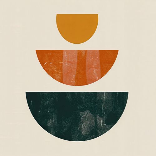 Plakat z serii boho zatytułowany Cykl Natury. Plakat przedstawia trzy przecinające się półkola, ułożone w pionowym szeregu, z których każde posiada unikalną fakturę i paletę barw - od spokojnego, złotego odcienia u góry, przez głęboką pomarańcz z akcentami ciepłej czerwieni pośrodku, do ciemnej, tajemniczej zieleni u dołu. Ta kompozycja wywołuje wrażenie harmonijnego przepływu czasu lub cykli natury. Świetnie sprawdzi się jako dekoracja w nowoczesnych przestrzeniach, takich jak minimalistyczne biura, salony w stylu skandynawskim, a także jako wyrafinowany akcent w strefach wypoczynkowych kawiarni lub butikowych hoteli.