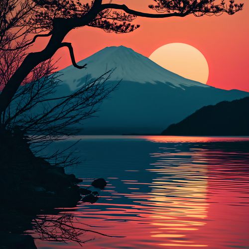Plakat z serii motywy wschodnie zatytułowany Góra Wieczorem. Urokliwe przedstawienie ikonicznej góry o zachodzie słońca, gdzie ciepłe odcienie czerwieni i pomarańczy rozlewają się po niebie i wodnej tafli, tworząc lustrzane odbicie. Sylwetka drzewa i góry na tle zachodzącego słońca wprowadzają atmosferę zen i wewnętrznej równowagi. Idealny dla miłośników estetyki wabi-sabi i minimalizmu, doskonale wpasuje się w nowoczesne wnętrza, a także wszędzie tam, gdzie pragnie się wprowadzić element uspokajającej natury.
