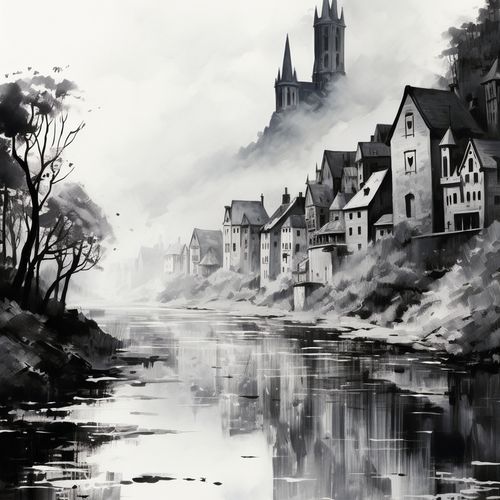 Plakat z serii pejzaże zatytułowany Mglisty Refleks. Misterne pociągnięcia pędzla przedstawiają starą wieś schowaną w mrocznych zakątkach gór, z dominującymi wieżami kościoła wznoszącymi się nad nią. Mgła otulająca krajobraz i odbicie w spokojnej wodzie tworzą atmosferę tajemniczości i zadumy. Monochromatyczna paleta barw dodaje głębi i intensywności całemu obrazowi, czyniąc go idealnym wyborem dla klasycznych salonów oraz miejsc takich jak kawiarnie o historycznym charakterze czy ekskluzywne kluby dyskusyjne.