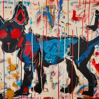 Plakat z serii abstrakcja zatytułowany Miejski Pies. Żywa kompozycja przedstawia sylwetkę psa w stylu street art w której dominują kolory takie jak czerwień, niebieski i żółty, które są rozmieszczone na płótnie w sposób dynamiczny i spontaniczny. Praca wydaje się być pełna ruchu dzięki pociągnięciom pędzlem i kroplom farby rozpryskującym się w różnych kierunkach. Na pierwszy plan wyłania się czarna sylwetka psa, której kontury są podkreślone kontrastującymi barwami i szkicowym stylem. W tle można dostrzec chaotyczne linie i formy, które mogą symbolizować miejski chaos i energię, a także fragmenty tekstu, które dodają dziełu charakteru ulicznego muralu. Całość sprawia wrażenie radosnej i pełnej energii ekspresji artystycznej. Świetnie sprawdzi się w nowoczesnych przestrzeniach miejskich.