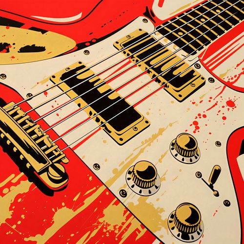 Plakat z serii abstrakcja zatytułowany Przed Graniem. Przedstawia zbliżenie na czerwoną gitarę elektryczną, której design jest wyrazisty i pełen energii. Widać detale instrumentu, takie jak przetworniki, potencjometry i struny, które są wyraźnie zaznaczone kontrastującymi kolorami złota, czerni i bieli na tle intensywnej czerwieni. Rozpryski i plamy farby na korpusie gitary nadają plakatowi surowy, rockowy charakter, co może sugerować żywiołowość i pasję muzyki granej na tym instrumencie. Ten obraz mógłby być atrakcyjnym elementem dekoracyjnym w przestrzeniach dedykowanych muzyce, takich jak sale prób, studia nagraniowe, pokoje młodzieżowe lub jako odważny akcent w nowoczesnym salonie.