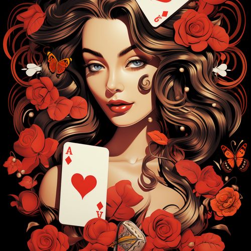 Plakat z serii abstrakcja zatytułowany Różany Hazard. Ta bogato zdobiona grafika przedstawia portret kobiety z królewskim spokojem, otoczoną przez wirujące karty z sercami i rozkwitające czerwone róże. Jej włosy płynnie przechodzą w kwiatowe motywy, a spojrzenie jest pełne tajemnicy i uroku. Motyle i drobne perełki dodają kompozycji element fantazji i delikatności. Wszystko to na tle głębokiej czerni, która eksponuje intensywność kolorów i detali. Plakat ten jest idealny dla przestrzeni, które chcą dodać element romantyzmu i wyrafinowania, jak eleganckie sypialnie, prywatne kolekcje czy luksusowe salony. Jego barwna paleta i symboliczne elementy sprawiają, że jest to dzieło, które przyciąga wzrok i pobudza wyobraźnię.