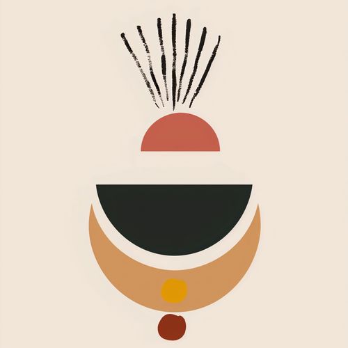 Plakat z serii boho zatytułowany Spójna Refleksja.Grafika ukazuje abstrakcyjną kompozycję geometrycznych kształtów w spójnej, ciepłej palecie barw, sugerującą delikatność i równowagę. Cechą charakterystyczną są wydłużone, smukłe linie wychodzące z półkola na górze, które mogą przypominać promienie słońca czy roślinne motywy. Ten plakat doskonale wpasuje się w nowoczesne i minimalistyczne przestrzenie, takie jak jadalnie, salony, a nawet kreatywne przestrzenie pracy, gdzie może stanowić spokojny punkt skupienia i inspirować do przemyśleń.