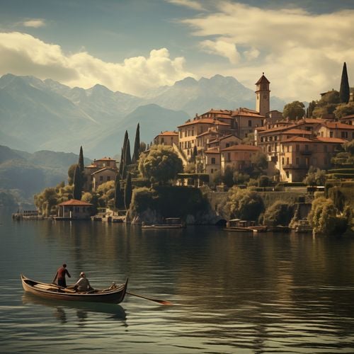 Plakat z serii pejzaże zatytułowany Spokojna Nostalgia, ten urzekający pejzaż przenosi nas do sielankowej wioski nad jeziorem, gdzie czas zdaje się płynąć wolniej. Łagodne światło rozlewające się nad architekturą wioski i gładką powierzchnią wody tworzy poczucie ciepła i spokoju. Para przemieszczająca się łodzią dodaje element ludzki, harmonijnie wpisując się w krajobraz. To dzieło sztuki idealnie nadaje się do przestrzeni, które mają na celu wprowadzenie atmosfery spokoju i refleksji, takich jak biblioteki, poczekalnie lub prywatne gabinety, zapewniając odprężającą ucieczkę od codziennego zgiełku.
