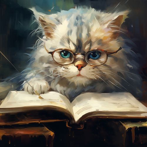 Plakat z serii abstrakcja zatytułowany Ucz Się Ucz. Plakat prezentuje uroczego, puszystego kota rasy perskiej, który z zadumą spogląda przez okulary w stylu vintage, przypominające okulary profesora. Kot wydaje się być zanurzony w lekturze otwartej książki, której strony delikatnie dotyka łapą. Całość jest utrzymana w ciepłej, złotej kolorystyce, co nadaje scenie przytulny, kameralny nastrój. Plakat ma charakter impresjonistyczny, z widocznymi pociągnięciami pędzla, które dodają dynamizmu i tekstury. Ten plakat idealnie wpasowałby się w atmosferę bibliotek, zakątków do czytania, a nawet jako dekoracja w salonach lub gabinetach, dodając wnętrzu intelektualnego charakteru i ciepła.