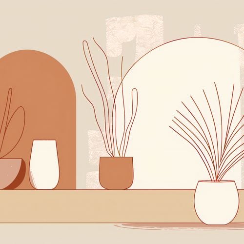 Plakat z serii boho zatytułowany Widok Roślin. Plakat przedstawia trzy stylizowane donice z roślinami, umieszczone na półce w harmonijnym ułożeniu, na tle geometrycznych kształtów w ciepłych, pastelowych kolorach. Proste linie i spokojne barwy tworzą atmosferę relaksu i spokoju, a subtelne tekstury dodają głębi i zainteresowania.Świetnie sprawdzi się w wnętrzach, które cenią sobie spokój i naturalne elementy, takich jak jasne salony, przytulne sypialnie lub miejsca wypoczynku. Jest to idealny wybór dla miłośników minimalizmu i skandynawskiej estetyki.