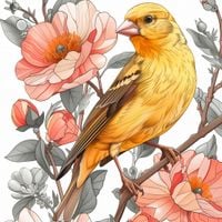Plakat z serii natura zatytułowany Wiosenny Śpiewaczek przedstawia pełną detali i życia scenę, w której jaskrawo żółty ptak, przypominający kanarka, spoczywa na gałęzi wśród kwitnących kwiatów. Delikatne i subtelne kolory kwiatów w pastelowych odcieniach różu i pomarańczu tworzą miękki kontrast do żywego upierzenia ptaka. Precyzyjne linie i staranne cieniowanie nadają ilustracji realistycznego wyglądu, a roślinność w tle jest równie szczegółowo wykonana, co dodaje kompozycji głębi i bogactwa. Ten plakat to celebracja wiosennego odrodzenia i piękna natury, idealny do ożywienia każdego wnętrza, szczególnie pokoju dziennego, przestrzeni odpoczynkowej lub kawiarni o przytulnej atmosferze.