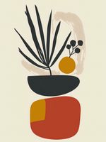 Plakat z serii boho zatytułowany Botaniczny Wgląd.Grafika łączy organiczną formę roślin z abstrakcyjnymi, geometrycznymi kształtami, tworząc kompozycję, która jest zarówno nowoczesna, jak i naturalna. Czarne, eleganckie liście wyłaniają się z ciemnej, okrągłej doniczki, kontrastując z ciepłymi odcieniami pomarańczu i żółci, które mogą symbolizować słońce lub owoc. Delikatne, nieregularne pociągnięcia pędzlem w tle nadają dziełu głębi i tekstury, dodając do czystych linii i bloków kolorów ciepło i ruch.Plakat wprowadzi do wnętrza życie i sztukę w dosłowny sposób, będąc idealnym akcentem w przestrzeniach, gdzie chce się połączyć sztukę współczesną z elementami naturalnymi, takimi jak salony, przestrzenie mieszkalne, czy biurowe, a nawet miejsca takie jak kawiarnie i butiki, które cenią sobie spokój i harmonię.