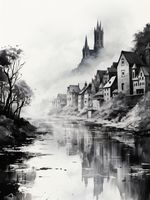 Plakat z serii pejzaże zatytułowany Mglisty Refleks. Misterne pociągnięcia pędzla przedstawiają starą wieś schowaną w mrocznych zakątkach gór, z dominującymi wieżami kościoła wznoszącymi się nad nią. Mgła otulająca krajobraz i odbicie w spokojnej wodzie tworzą atmosferę tajemniczości i zadumy. Monochromatyczna paleta barw dodaje głębi i intensywności całemu obrazowi, czyniąc go idealnym wyborem dla klasycznych salonów oraz miejsc takich jak kawiarnie o historycznym charakterze czy ekskluzywne kluby dyskusyjne.