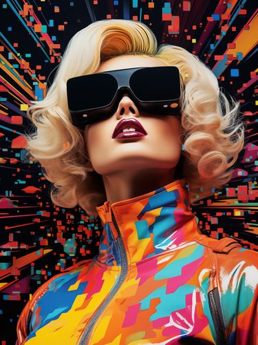 Plakat z serii pop art zatytułowany Retro Futuryzm. Ta żywa i energetyczna ilustracja przedstawia stylizowaną kobietę z epoki retro w futurystycznych okularach przeciwsłonecznych, które odbijają dynamiczne, neonowe światła. Jej kurtka w kolorach intensywnych i nasyconych tworzy kontrast z jasnymi lokami, tworząc silny wizualny efekt. Plakat łączy nostalgię za przeszłością z wizją przyszłości, idealny dla przestrzeni o wyrafinowanym designie, takich jak modne salony, studia projektowe, a także jako śmiały akcent w nowoczesnych wnętrzach mieszkalnych.