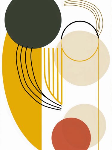 lakat z serii minimalistyczne zatytułowany Słońce i Cienie. Przedstawia on zbiór geometrycznych kształtów w ciepłej palecie barw, w którym dominuje złocista żółć przypominająca słońce. Okrągłe i półokrągłe formy zestawione z liniowymi elementami tworzą wizualną grę światła i cienia, nawiązując do cyklu dnia i nocy oraz dynamiki między jasnością a mrokiem. Plakat ten z pewnością ożywi i doda charakteru nowoczesnym biurom, przestrzeniom kreatywnym, a także może stanowić elegancki akcent w minimalistycznych salonach lub sypialniach, dodając im ciepła i artystycznej głębi.