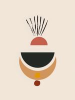 Plakat z serii boho zatytułowany Spójna Refleksja.Grafika ukazuje abstrakcyjną kompozycję geometrycznych kształtów w spójnej, ciepłej palecie barw, sugerującą delikatność i równowagę. Cechą charakterystyczną są wydłużone, smukłe linie wychodzące z półkola na górze, które mogą przypominać promienie słońca czy roślinne motywy. Ten plakat doskonale wpasuje się w nowoczesne i minimalistyczne przestrzenie, takie jak jadalnie, salony, a nawet kreatywne przestrzenie pracy, gdzie może stanowić spokojny punkt skupienia i inspirować do przemyśleń.