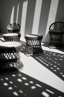 Plakat z serii wnętrza zatytułowany Gra Świateł to stylowa, monochromatyczna fotografia, która oddaje estetykę współczesnego designu. Na fotografii widzimy zestaw eleganckich, plecionych stołków z rattanu ustawionych na tle geometrycznych cieni. Ostre linie cieni przełamują okrągłe kształty mebli, tworząc fascynującą kompozycję pełną kontrastów. Białe siedziska stołków pięknie kontrastują z ciemniejszymi elementami, a gra światła i cienia nadaje scenie trójwymiarowość i teksturę. Plakat ten będzie doskonały dla miłośników minimalistycznych wnętrz, a także dla osób poszukujących elementu dekoracyjnego, który wprowadzi do pomieszczenia nowoczesny i artystyczny akcent. Idealny do nowoczesnych przestrzeni mieszkalnych, biur, kawiarni lub galerii sztuki.