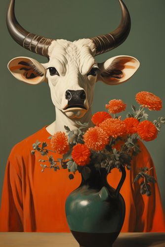 Plakat z serii wnętrza zatytułowany Harmonia Kontrastów. Byk o majestatycznym wyglądzie z intensywnym spojrzeniem, podkreślany przez imponujące rogi i białą sierść, staje w kontraście z delikatnością kwiatów pomarańczowych, które zdobią jego otoczenie. Pomarańczowa tunika, którą nosi, łączy się z barwą kwiatów, tworząc jednolitą paletę barw. Te zaskakujące połączenie elementów dodaje obrazowi nuty fantazji i oryginalności. Idealnie wpisuje się w nowoczesne wnętrza oraz galerie sztuki, gdzie ekscentryczność i kreatywność są na pierwszym planie.