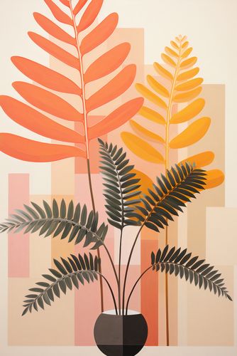 Plakat z serii wnętrza zatytułowany Harmonia Natury. Geometryczne kształty tła w delikatnych pastelowych odcieniach łączą się z organicznymi formami liści w energetycznych barwach czerwieni, żółci i zieleni. Ciemna, minimalistyczna waza stanowi mocny akcent, który spaja całość kompozycji. Ta unikalna kombinacja klasycznych i nowoczesnych elementów tworzy wizualną opowieść o równowadze i elegancji natury w urbanistycznym środowisku. Świetnie sprawdzi się w nowoczesnych biurach, w przestrzeniach artystycznych galerii czy w minimalistycznych loftach, gdzie design łączy się z naturą.