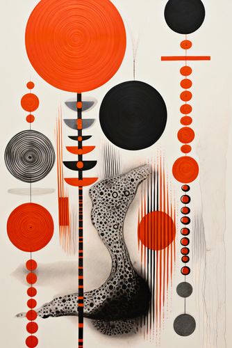 Plakat z serii abstrakcja zatytułowany Kontrastowy Kosmos. Fascynująca gra kontrastujących kolorów i kształtów, gdzie czerwone koła ożywiają monochromatyczne tło. Finezyjne tekstury i linie tworzą abstrakcyjny krajobraz przypominający kosmiczną przestrzeń. Czarne i czerwone elementy kontrastują ze sobą, dodając głębokości i wymiaru do kompozycji. Świetnie sprawdzi się w nowoczesnych biurach, galeriach sztuki oraz minimalistycznych salonach.