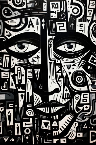 Plakat z serii abstrakcja zatytułowany Labirynt Myśli. Intrygujące oczy spoglądające z głębi obrazu są otoczone złożonymi wzorami i symbolami, które łączą się, tworząc enigmatyczny portret. Czarno-białe barwy kontrastują ze sobą, dodając dziełu intensywności i głębi. Złożoność wzorów symbolizuje skomplikowane myśli i emocje, które kryją się za ludzkim spojrzeniem. Świetnie sprawdzi się w nowoczesnych biurach, galeriach sztuki oraz w przestrzeniach przeznaczonych dla miłośników abstrakcyjnej ekspresji.