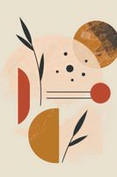 Plakat z serii boho zatytułowany Przyrost do Tła.Plakat przedstawia abstrakcyjną kompozycję złożoną z prostych, geometrycznych form i roślinnych motywów. Dominują tutaj ciepłe odcienie pomarańczowego, różu i brązu, które mieszają się z czernią i beżem. Na pierwszym planie mamy elementy roślinne, które mogą przypominać liście lub gałązki, zaś w tle znajdują się różnej wielkości i faktury koła. Całość jest stylizowana i uproszczona, co daje efekt współczesnego, designerskiego dzieła sztuki. Obraz może inspirować poczuciem spokoju i natury, jednocześnie zachowując modernistyczne uczucie. Idealnie wpasuje się w nowoczesne wnętrze jako centralny punkt dekoracyjny lub delikatne uzupełnienie estetyczne.
