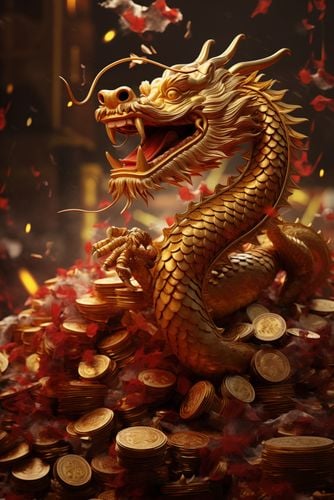 Plakat z serii motywy wschodnie zatytułowany Smok Bogactwa. Ilustracja ta ukazuje potężnego złotego smoka, symbol siły i pomyślności w wielu kulturach wschodnich, unoszącego się nad skarbami. Smok, z szeroko otwartymi szczękami, wydaje się ryczeć triumfalnie, otoczony przez wirujące złote monety i kwiaty, co dodaje kompozycji dynamizmu. Żywe kolory i szczegółowe wykonanie smoka sprawiają, że plakat jest pełen życia i energii. Plakat ten jest doskonałym wyborem dla miłośników sztuki orientalnej oraz jako element dekoracyjny wnętrz, które chcą wprowadzić elementy bogatej symboliki i kulturowej głębi, takich jak domowe biura, pokoje do medytacji czy ekskluzywne salony.