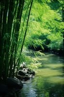 Plakat z serii natura zatytułowany Spokój Bambusów. Ukazuje on idylliczny zakątek przyrody, gdzie zielone pędy bambusa delikatnie zginają się nad błogim, spokojnie płynącym strumieniem. Gra światła i cienia na liściach bambusa tworzy wrażenie głębi i spokoju, zaś szemrząca woda dodaje uczucie świeżości i czystości. Ten plakat oddaje piękno i spokój odosobnionego zakątka natury, jest więc idealny dla przestrzeni relaksacyjnych takich jak spa, pokoje do medytacji lub jako ukojenie w zgiełku codzienności w domowych wnętrzach. To doskonała dekoracja dla tych, którzy pragną wprowadzić element natury i harmonii do swojego otoczenia.