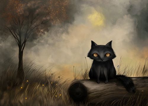 Plakat z serii abstrakcja zatytułowany Czarny Kot. Przedstawia on czarnego kota o hipnotyzujących, złotych oczach, siedzącego na polanie w ciepłych promieniach zachodzącego słońca. Drzewo o gołych gałęziach i delikatne światła odbijające się w tle tworzą atmosferę tajemniczości i spokoju. Złote i brązowe odcienie sceny, połączone z subtelnymi akcentami świetlnymi, nadają ilustracji uczucie ciepła i spokojnej zadumy.Ten plakat będzie doskonałym dodatkiem do wnętrz, które pragną wprowadzić element spokoju i kontemplacji, idealny do salonu, sypialni czy gabinetu. Zapewnia on poczucie towarzystwa i spokoju, wprowadzając do pomieszczenia ciepło i urok wieczornej aury.