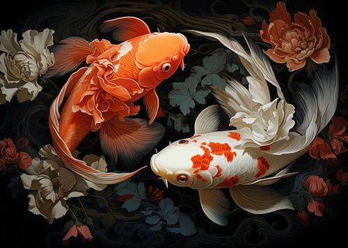 Plakat z serii motywy wschodnie zatytułowany Harmonijny Taniec to arcydzieło, które wyraża subtelność i równowagę przez harmonijne współistnienie natury i sztuki. Dwie ryby koi, jedna w odcieniach płomiennego pomarańczu, druga w pastelowych barwach kremu z akcentami czerwieni, są przedstawione w eleganckim tańcu, który jest tak płynny i gracji jak ruchy baletnicy. Ich delikatne płetwy przypominają falujące tkaniny, unoszące się w wodnym balecie, otoczone przez misternie malowane kwiaty, które dodają całości organicznej głębi. To zmysłowe i prowokujące do refleksji dzieło, które doskonale uzupełni każde wyrafinowane wnętrze, od stylowych kawiarni po intymne przestrzenie prywatne, gdzie design łączy się z naturalnym pięknem.