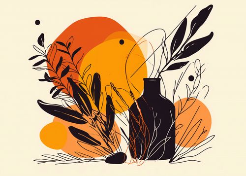 Plakat z serii minimalistyczne zatytułowany Jaskrawy Zachód. Na grafice widnieje silnie stylizowany motyw roślinny, gdzie czarne sylwetki roślin kontrastują z jaskrawo pomarańczowym i żółtym tłem, przypominającym zachodzące słońce. W tle pojawiają się delikatne, abstrakcyjne linie i kształty, dodające kompozycji głębi i tekstury.Ten plakat doskonale wpasuje się w wnętrza ożywione roślinnością, zarówno te domowe, jak i komercyjne przestrzenie typu kawiarnie lub sklepy z roślinami. Jego ciepłe barwy będą wprowadzać przytulną atmosferę i mogą stanowić żywy akcent w przestrzeniach utrzymanych w naturalnej kolorystyce.