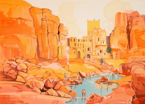 Plakat z serii abstrakcja zatytułowany Ruiny pod Słońcem. Ta ilustracja przedstawia scenę z antycznymi ruinami w ciepłej, pastelowej palecie kolorów, która oddaje odczucie spiekoty i światła słonecznego. Zarysy starożytnej architektury wyrastają z pustynnego krajobrazu, nadając scenerii poczucie wieczności i historii. Odbicie wody i subtelne sylwetki postaci w tle wprowadzają ludzki wymiar do tej scenerii, sugerując trwającą obecność i ciągłość cywilizacji. Plakat ten idealnie wprowadzi do każdego wnętrza element przygody i odkryć, inspirowany podróżami i historią, idealny dla przestrzeni publicznych, biur podróży, a także jako dekoracja w domach miłośników historii.