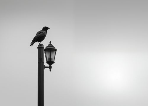 Obraz z serii wnętrza zatytułowany Samotny Postój Kruka. Prezentuje on sylwetkę kruka spoczywającego na klasycznej latarni ulicznej, uchwyconą w monochromatycznej palecie szarości. Ten spokojny, lecz sugestywny plakat jest symbolem refleksji i tajemnicy, doskonale wpisując się w klimat współczesnych przestrzeni miejskich. Praca ta z pewnością stanie się wyrazistym dodatkiem do nowoczesnych wnętrz, takich jak lofty czy minimalistyczne salony, a także wniesie element zastanowienia do przestrzeni publicznych takich jak galerie, kawiarnie i biblioteki, gdzie odosobnienie miesza się z miejskim zgiełkiem.