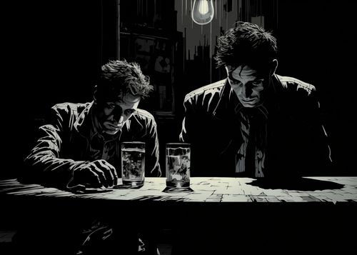 Plakat z serii abstrakcja zatytułowany Spiskowcy. Ta grafika przedstawia dwóch mężczyzn zanurzonych w głębokiej konwersacji przy barowym stole. Stylizacja na czarno-biało uchwyciła napięte, dramatyczne oświetlenie i cienie, które nadają scenie klimat tajemniczości i suspensu. Wyraźne kontury i kontrastowe światłocienie podkreślają wyraziste postaci mężczyzn i ich zacięte postawy. Plakat ten przemawia do miłośników klasycznego kina i literatury, doskonale nadając się do dekoracji przestrzeni o męskim charakterze, takich jak prywatne gabinety, domowe bary czy miejsca spotkań.