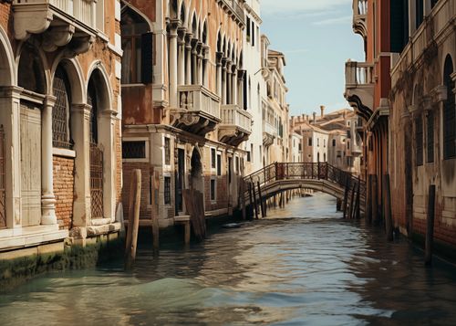 Plakat z serii pejzaże zatytułowany Wenecjańska Uroda, obraz ukazuje spokojny kanał w Wenecji, gdzie woda płynie leniwie, odzwierciedlając zabytkowe fasady wąskich domów. Delikatne światło rozlewa się po kanałach, a mały, kamienny most łączy ze sobą dwie tajemnicze ulice, dodając scenie romantycznego uroku. Ta idylliczna sceneria przenosi widza do serca włoskiej elegancji, pełnej historii i spokoju. Idealny do zawieszenia w przestrzeniach, które cenią klasykę i subtelne piękno, takich jak eleganckie salony, tradycyjne restauracje czy hotelowe lobby.