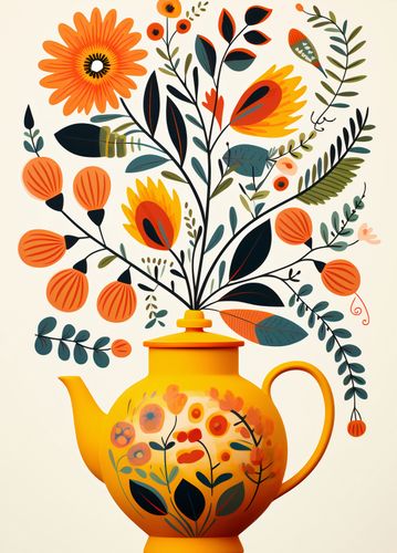 Plakat z serii wnętrza zatytułowany Bujna Herbata. Zachwycające, soczyste barwy kwiatów i liści wyrastających z eleganckiego żółtego dzbanka do herbaty, na którym uwagę przyciągają malowane motywy roślinne. Wzory i kolory wspaniale harmonizują ze sobą, tworząc kompozycję pełną życia i radości. Delikatne linie i estetyczny układ sprawiają, że prace ożywiają każdą przestrzeń. Świetnie sprawdzi się w kawiarniach, herbaciarniach jak i również w domowych jadalniach czy salonach.
