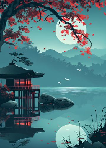 Plakat z serii motywy wschodnie zatytułowany Japoński Pawilon. Ten plakat emanuje spokojem dzięki scenie przedstawiającej tradycyjny japoński pawilon, otoczony przez wodę i delikatnie pochylające się czerwone liście klonu. Ciepłe światło wschodzącego księżyca i subtelne odbicie w wodzie podkreślają atmosferę ciszy i refleksji. Delikatne sylwetki przelatujących ptaków dodają element życia i ruchu. Plakat ten idealnie wpisuje się w przestrzenie współczesne, minimalistyczne, a także te, które celebrują naturę i spokój, takie jak pokoje do medytacji, jadalnie, czy też poczekalnie w spa.